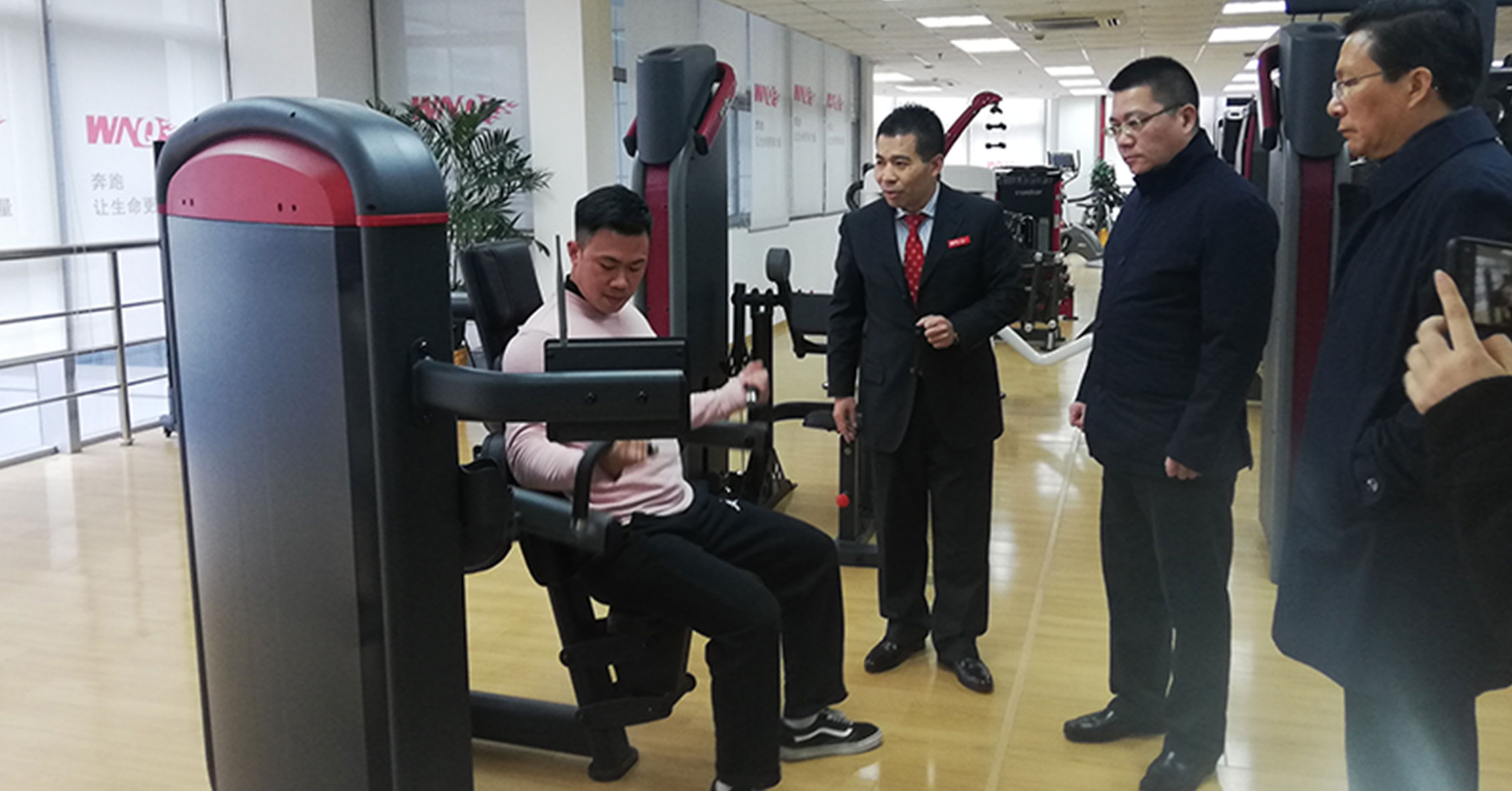 許副局長一行先參觀了jiuyou.com器材展廳,對我們的企業文化、發展情況、健身器材產品等進行了詳細了解,并重點關注了2018年jiuyou.com推出的F1-7000美格力量單站系列、W2000變形金剛系列和F4、F6跑步機等新品,jiuyou.com的力量單站產品大管徑的優質選材、源自美國的外形設計和新品跑步機的智能化等特點深得領導一行的肯定。